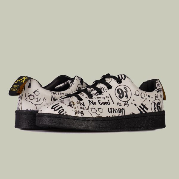 1. رنگ مشکی کفش آسفالت هری پاتر از جنس ورنی براق است با طرح های سفید